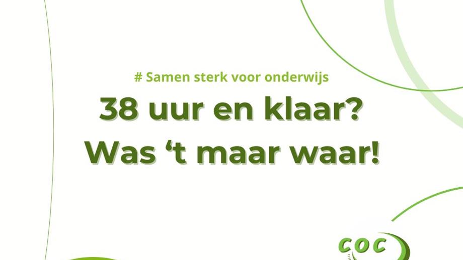 Er gaan stemmen op voor de invoering van een 38 urenweek in onderwijs. Het lijkt een mooi principe, maar past niet bij de realiteit. Veel onderwijspersoneelsleden besteden gemiddeld veel meer uur per week aan hun baan. Bovendien zijn sommige perioden drukker dan andere. “Dit idee is goed voor de publieke opinie”, horen we dan. “Het haalt het foute cliché van de baan dat een leerkracht maar 20 of 22 uur werkt.”