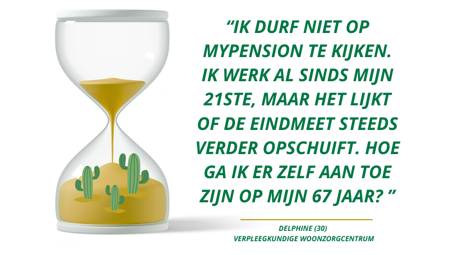 “Ik durf niet op MyPension te kijken,” zegt ze. “Ik werk al sinds mijn 21ste, maar het lijkt alsof de eindmeet alleen maar verder opschuift. En dan vraag ik me af: hoe ga ik er zelf aan toe zijn op mijn 67ste?”