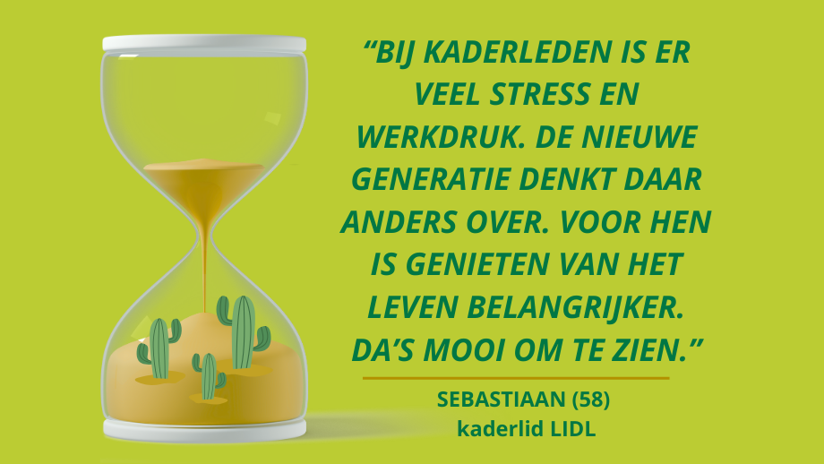 Op de werkvloer merkt Sebastiaan dat de animo om tot 67 jaar te blijven klein is. “Bij kaderleden is er weinig motivatie om zo lang te werken. De stress en druk zijn groot. En de nieuwe generatie denkt al helemaal anders. Voor hen is de work-life balance belangrijker dan geld. De maatschappij is veranderd: genieten van het leven telt nu ook. En dat is mooi om te zien.”